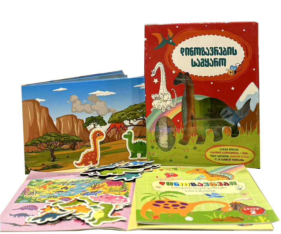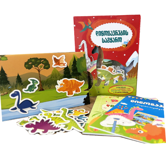 ამ არაჩვეულებრივი ნაკრების საშუალებით ცნობისმოყვარე პატარები იმოგზაურებენ პრეისტორიულ ხანაში, გაეცნობიან დინოზავრების სამყაროს და ერთმანეთს შეუთავსებენ სწავლასა და გართობას. ფერადი ილუსტრაციებით გაფორმებული სავარჯიშოების 2 წიგნში შეასრულებენ სახალისო და საინტერესო დავალებებს, ყუთში კი აღმოაჩენენ დინოზავრების თემაზე შექმნილ ფერად სტიკერებს, მაგნიტურ დაფასა და 30 მაგნიტურ დინოზავრს.