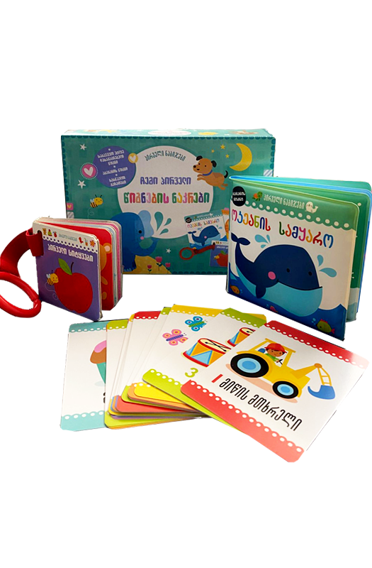 ყუთში აღმოაჩენთ ლამაზი ილუსტრაციებიტ გაფორმებულ აბაზანის წიგნს, საბავშვო ეტლზე დასამაგრებელ მუყაოს წიგნსა და ილუსტრირებულ სასწავლო ბარათებს: